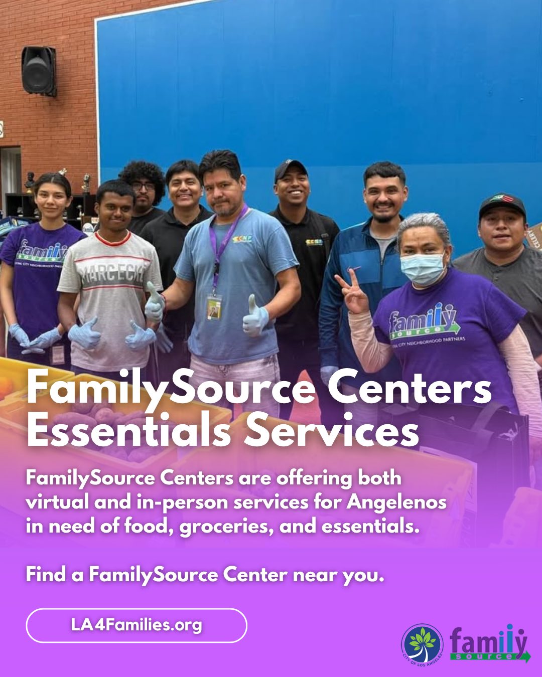 - LA City Family Source Centers can help provide weekly food distributions if you live in the City of Los Angeles and fall into their low-income threshold. For more information visit LA4Families.org.